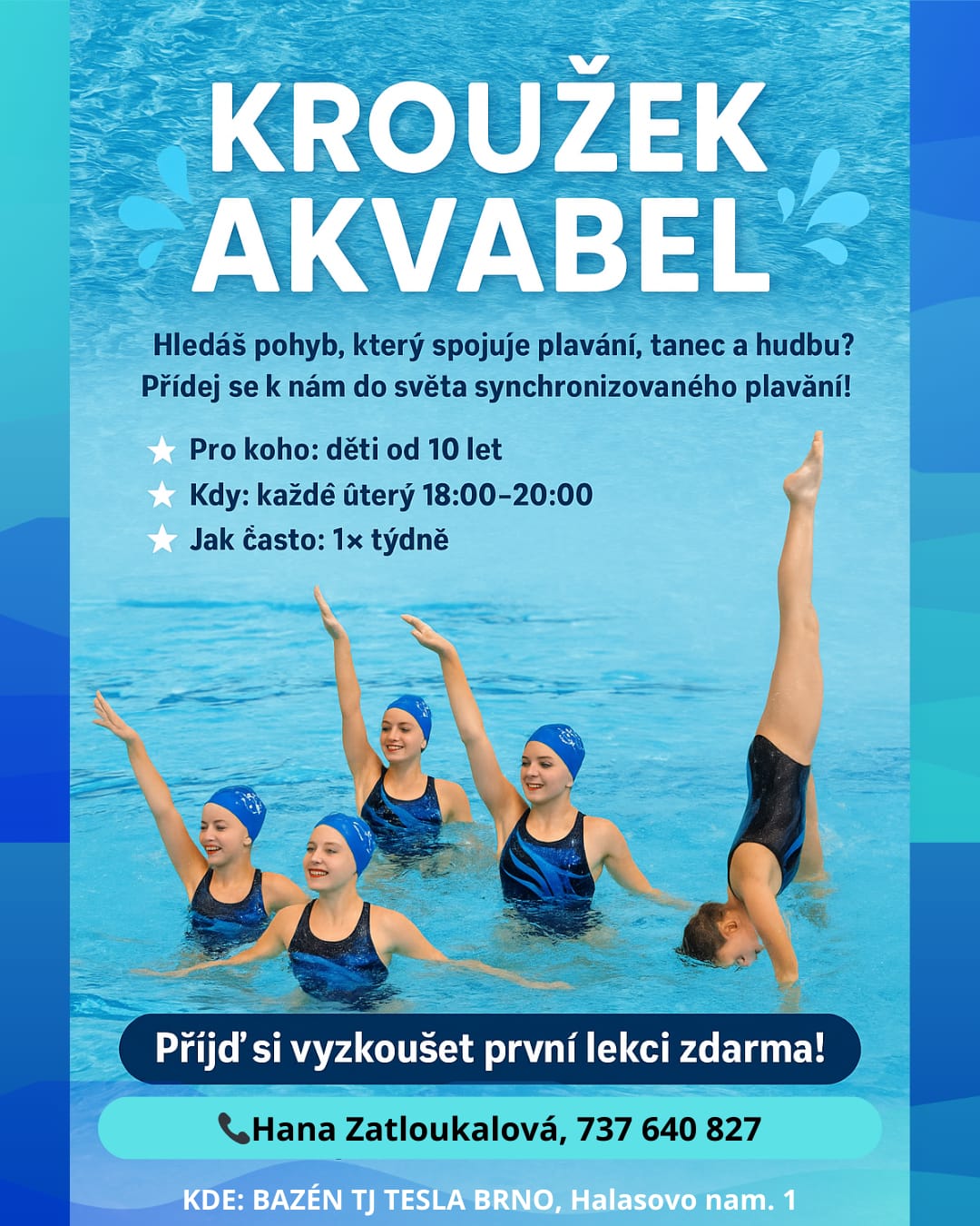 ✨ Kde: bazén TJ Tesla Brno, Halasovo nam. 1, Brno - Lesná